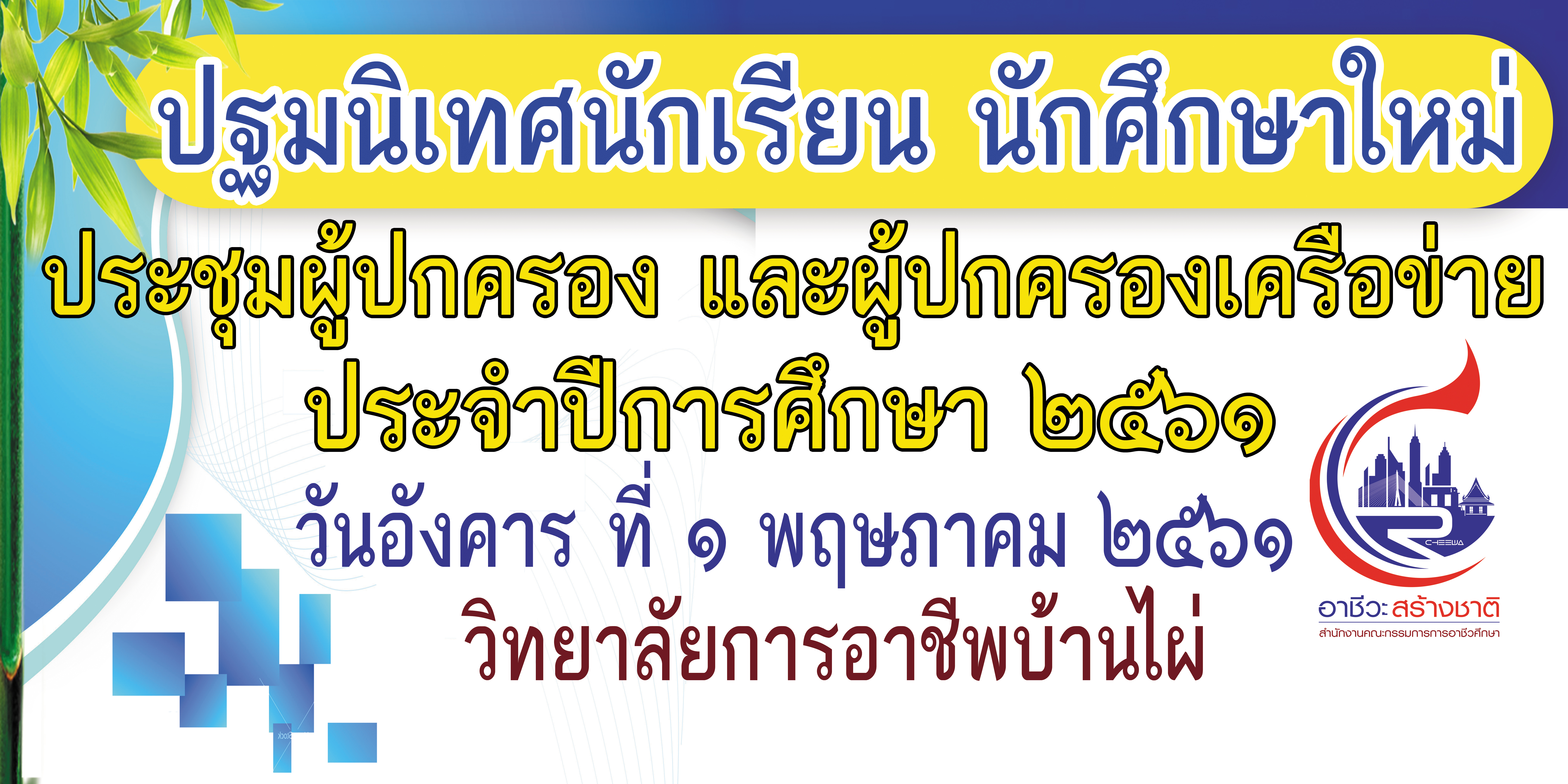 วิทยาลัยการอาชีพบ้านไผ่ ขอแจ้งข่าว…ปฐมนิเทศนักเรียนนักศึกษาใหม่ และประชุมผู้ปกครองนักเรียนนักศึกษาใหม่ ประจำปีการศึกษา 2561