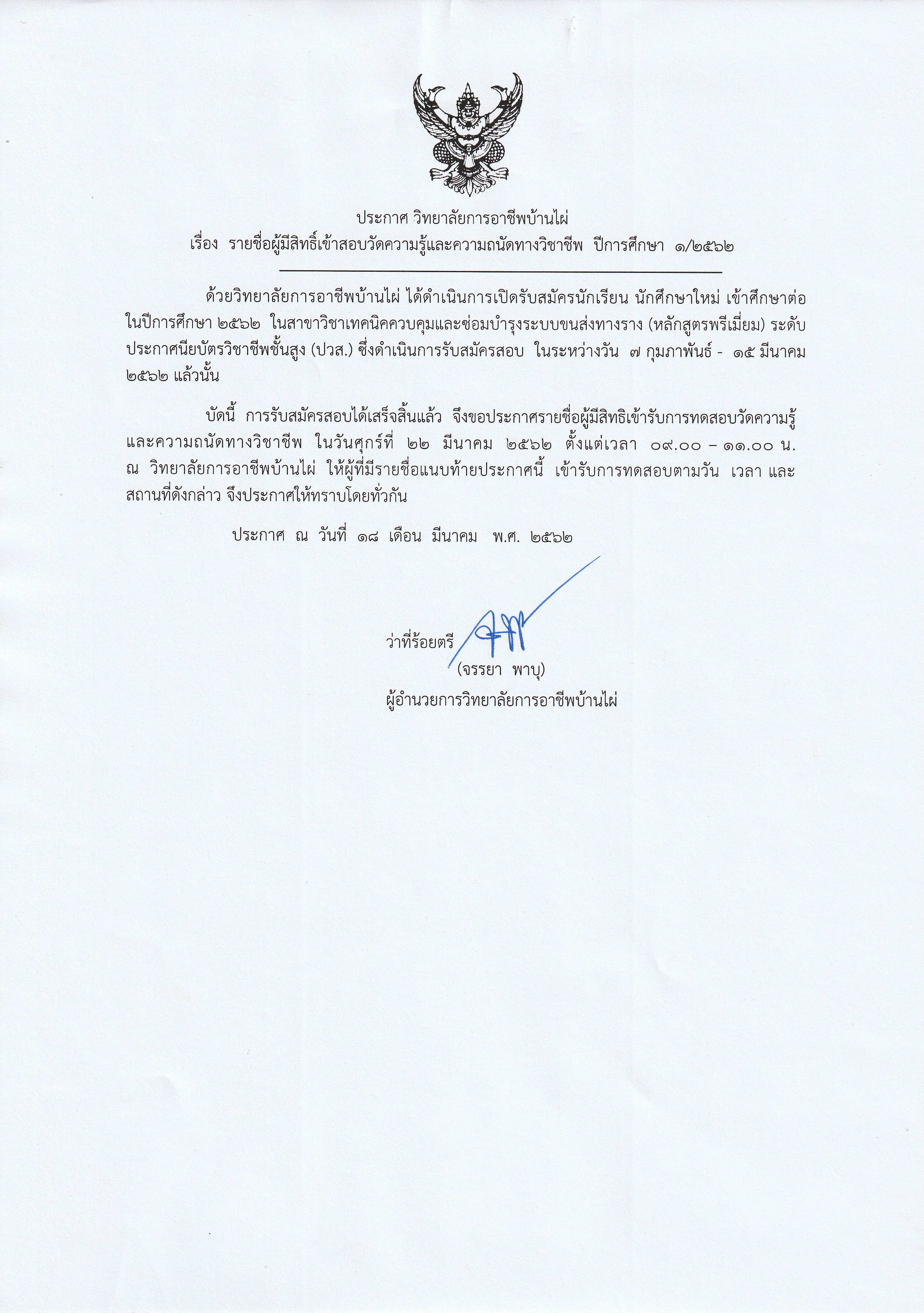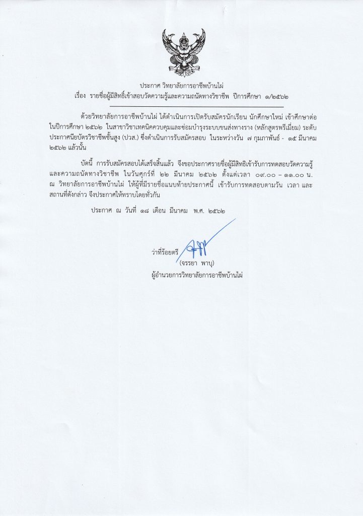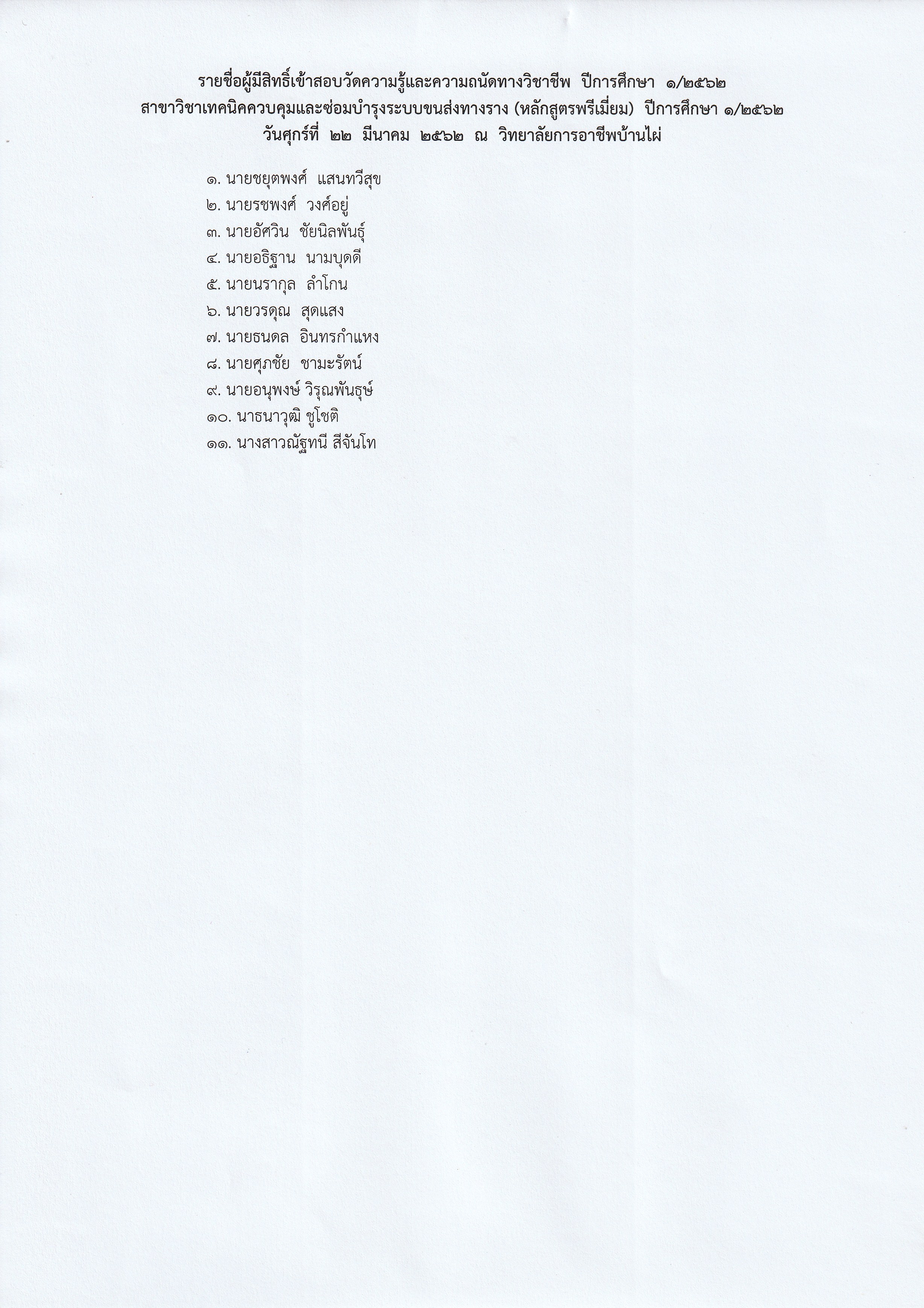 ประกาศ วิทยาลัยการอาชีพบ้านไผ่ เรื่อง รายชื่อผู้สิทธิ์เข้าสอบวัดความรู้และความถนัดวิชาชีพ ปีการศึกษา 1/2562 สาขาวิชาเทคนิคควบคุมและซ่อมบำรุงระบบขนส่งทางราง (หลักสูตรพรีเมี่ยม) #ทดสอบวันศุกร์ที่ 22 มีนาคม2562 เวลา 09.00-11.00 น.