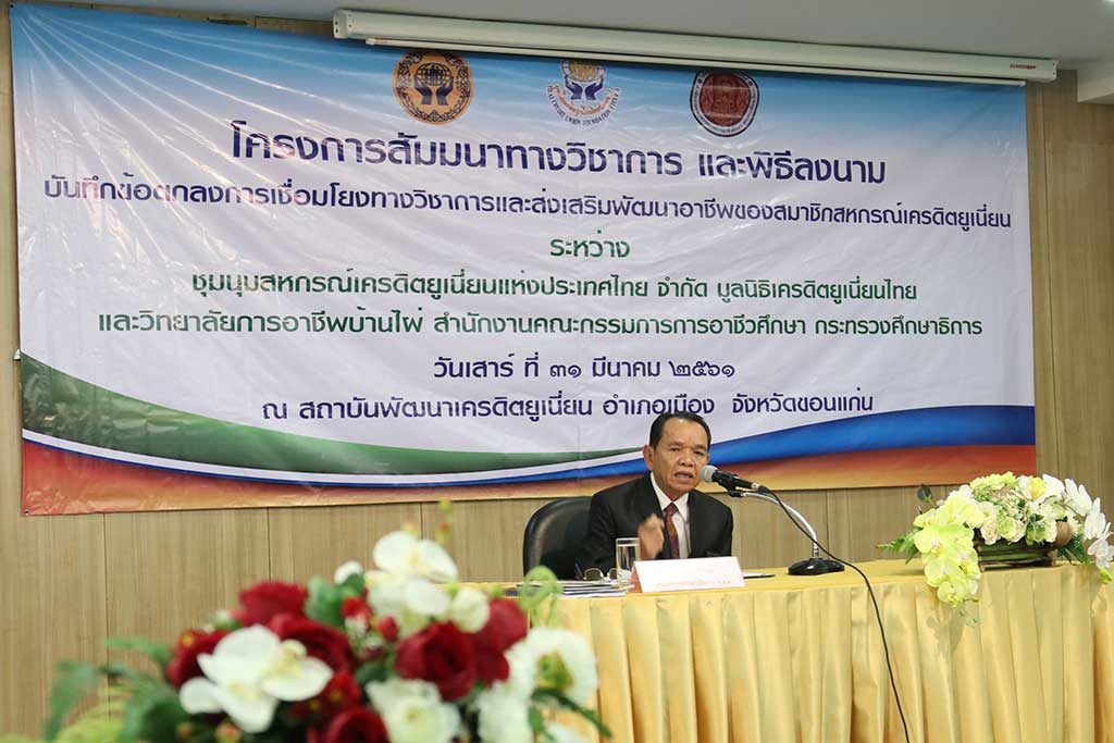 โดยมี นายสุภาพ จันทร์ภิรมย์ ประธานกรรมการ มูลนิธิเครดิตยูเนี่ยนไทย ให้เกียรติเป็นประธานในพิธีลงนามบันทึกข้อตกลงการเชื่อมโยงทางวิชาการและส่งเสริมพัฒนาอาชีพของสมาชิกสหกรณ์เครดิตยูเนี่ยน ในครั้งนี้ และเป็นการลงนามความร่วมมือ ร่วมกัน 3 องค์กร คือ ชุมนุมสหกรณ์เครดิตยูเนี่ยนแห่งประเทศไทย จำกัด โดยมี นายดาบชัย ใจสู้ศึก ผู้จัดการใหญ่ เป็นผู้แทนในการลงนาม อีกทั้ง มูลนิธิเครดิตยูเนี่ยนไทย โดยมีนายการุณ พรหมสินชัย รองประธาน คนที่ 2 เป็นผู้แทนลงนาม พร้อมด้วยผู้นำและสมาชิกสหกรณ์เครดิตยูเนี่ยนในเขตภาคตะวันออกเฉียงเหนือ ร่วมเป็นสักขีพยานในโอกาสนี้
